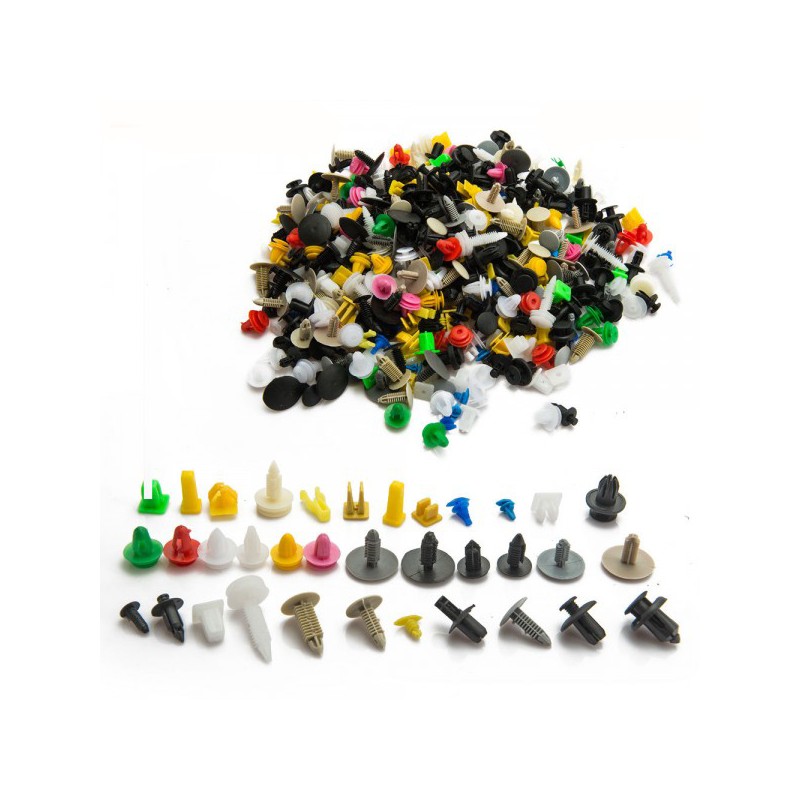 Zestaw uniwersalnych spinek / klipsów montażowych. Pasuje do większości popularnych marek samochodów.Ilość: 200 szt.