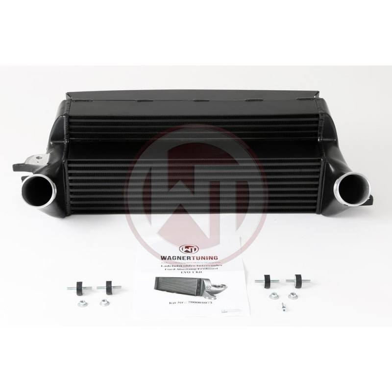 The Comp. Intercooler EVO1 has the following core size (535mm x206mm x150mm /stepped = 14.000cm³), providing a 45% larger frontal area and 130% more volume compared to the original intercooler. Ourers have increased the intercooler core size and efficiency, as well as improving the endtank design to remove any OEM bottlenecks, resulting in increased flow rating and charge cooling properties. This Mustang Intercooler uses our award winning WAGNERTUNING Comp. intercooler core which is made specifically this application. It is one of the highest quality Tube Fin cores available on the market. Featuring turbulators, a weight of just 10,2kg and combined z freeform cast aluminum endtanks optimized in CAD. Flow analyses and simulations were created to optimise the design best possible Internal Airflow. This intercooler is the best choice when it comes to Perf. gains and low intake temperatures. Anti corrosion protective powłoka z perfect thermal heat dissipating character. Optimal cooling z clearly more power. is ready installation (plug & play), using the stock plumbing. Fitment is easy, replacing the OEM intercooler. All of our products undergo rigorous quality control. On both sides the connection diameter is 65mm.