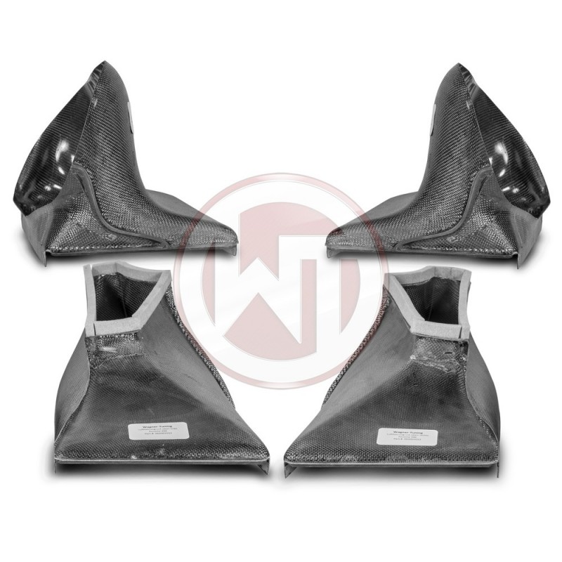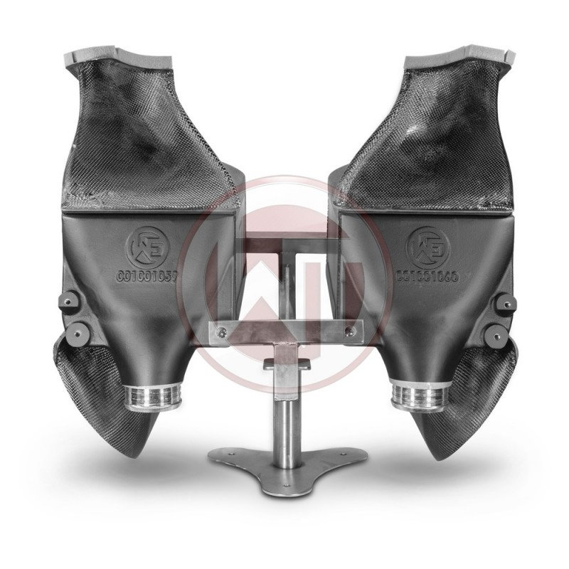 The Wagner Tuning Porsche 996 911 Turbo (S) Intercooler EVO2 has the following core size (2 x [330mm x 222mm x 145mm] = 21.244cm³), providing 77% more volume compared to the stock mounted intercooler. Ourers have increased the intercooler core size and efficiency, as well as improved the end tank design to remove any OEM bottlenecks, resulting in increased flow rating and charge cooling properties. This intercooler uses our award winning Wagner Tuning Comp. Intercooler Core which is made specifically this application. It is one of the highest quality Tube Fin cores available on the market. The intercooler has just a weight of 2x 6,7kg. Flow analyses and simulations were created to optimise the design best possible Internal Airflow. The Intercooler also includes a suitable carbon air shroud to ensure optimum airflow to the intercooler. As well as additional silicone hoses z an enlarged cross-section. This intercooler is the best choice when it comes to Perf. gains and low intake temperatures. Anti Corrosion protective powłoka z perfect thermal heat dissipating character. Optimal cooling z clearly more power. is ready installation. Fitment is easy, replacing the OEM intercooler. All of our products undergo rigorous quality control and are also tested by compressive strength of up to 6 bar. This intercooler is suitable racing. 70mm In and Outlets