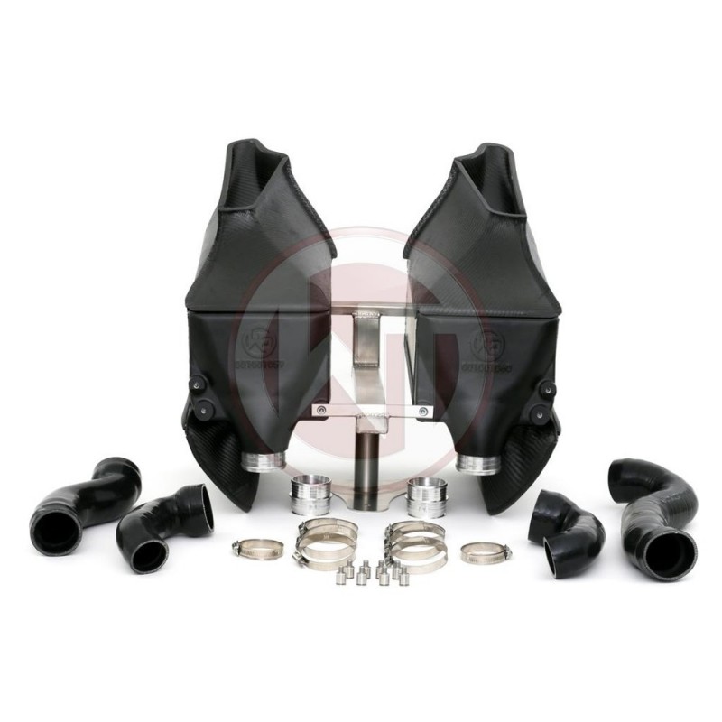 The Wagner Tuning Porsche 997 911 Turbo Intercooler EVO2 has the following core size (2 x [330mm x 222mm x 145mm] = 21.244cm³), providing 77% more volume compared to the stock mounted intercooler. Ourers have increased the intercooler core size and efficiency, as well as improved the end tank design to remove any OEM bottlenecks, resulting in increased flow rating and charge cooling properties. This intercooler uses our award winning Wagner Tuning Comp. Intercooler Core which is made specifically this application. It is one of the highest quality Tube Fin cores available on the market. The intercooler has just a weight of 2x 6,7kg. Flow analyses and simulations were created to optimise the design best possible Internal Airflow. The Intercooler also includes a suitable carbon air shroud to ensure optimum airflow to the intercooler. As well as additional silicone hoses z an enlarged cross-section. This intercooler is the best choice when it comes to Perf. gains and low intake temperatures. Anti Corrosion protective powłoka z perfect thermal heat dissipating character. Optimal cooling z clearly more power. is ready installation. Fitment is easy, replacing the OEM intercooler. All of our products undergo rigorous quality control and are also tested by compressive strength of up to 6 bar. This intercooler is suitable racing. 70mm In and Outlets.
